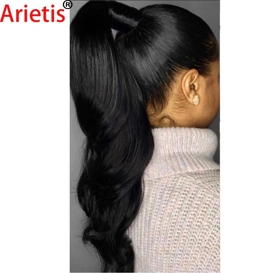 Name: 100% Remy malayo 8 "-24" onda del cuerpo envoltura alrededor de negro Natural Clip en cola de caballo extensión del cabello humano para las mujeres blancas en Arietis