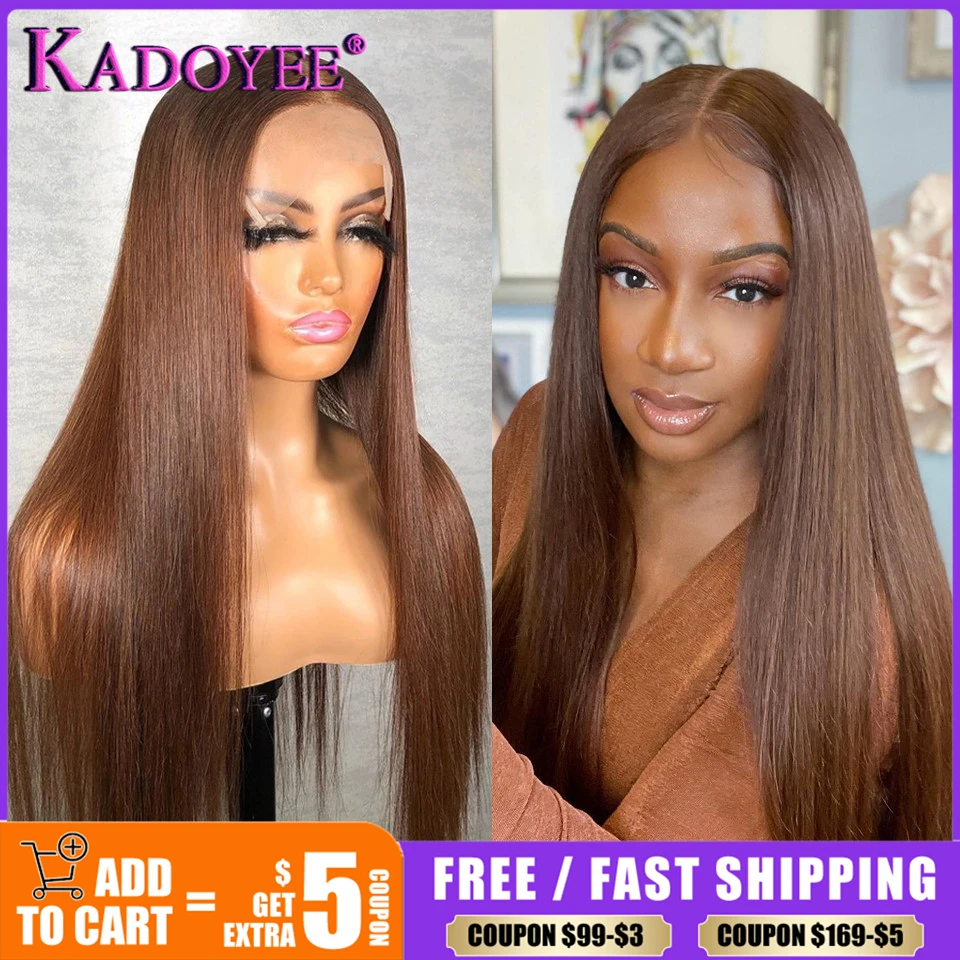 Name: Pelucas de cabello humano liso con cierre de encaje 4x4 para mujer, peluca marrón brasileña 180%, Color marrón, malla con división, Remy prearrancado, 13x1 T