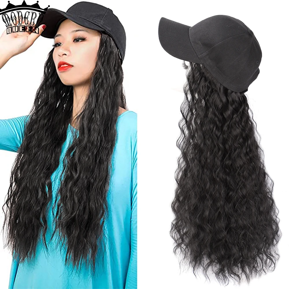 Name: Gorro de béisbol de rizado sintético largo para niña, Peluca de cabello ondulado, peluca de sombrero sintética de conexión natural ajustable
