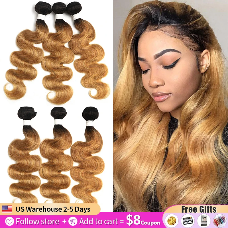 Name: T1B/27-mechones de pelo ondulado brasileño degradado, extensiones de pelo ondulado rubio miel de 8-26 pulgadas, 1/3/4 Uds.
