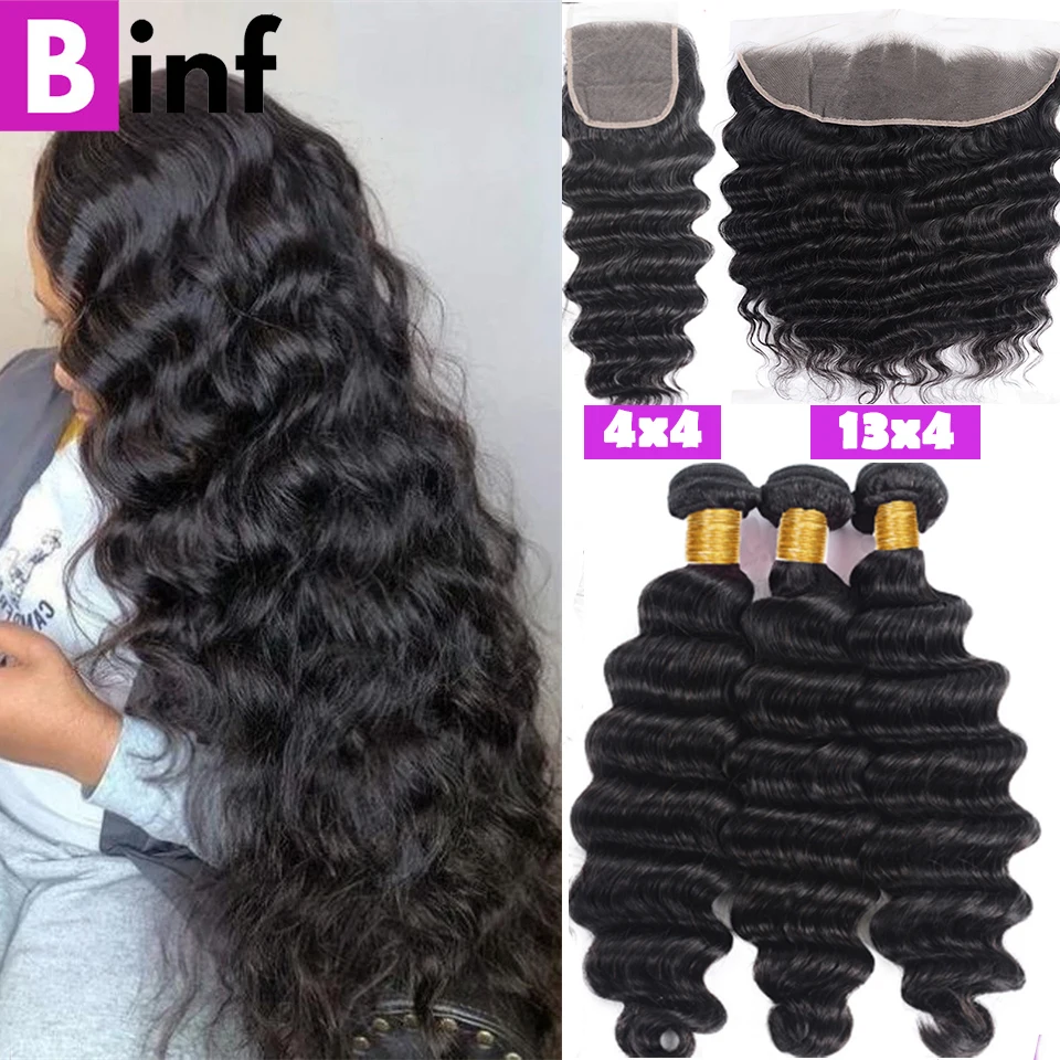 Mejor Extensiones de cabello natural de BINF Official Store por Mechones de ondas profundas sueltas 32 34 36 38 40 pulgadas, cabello Remy peruano Frontal, 3/4 mechones con cierre y Frontal negro Natural