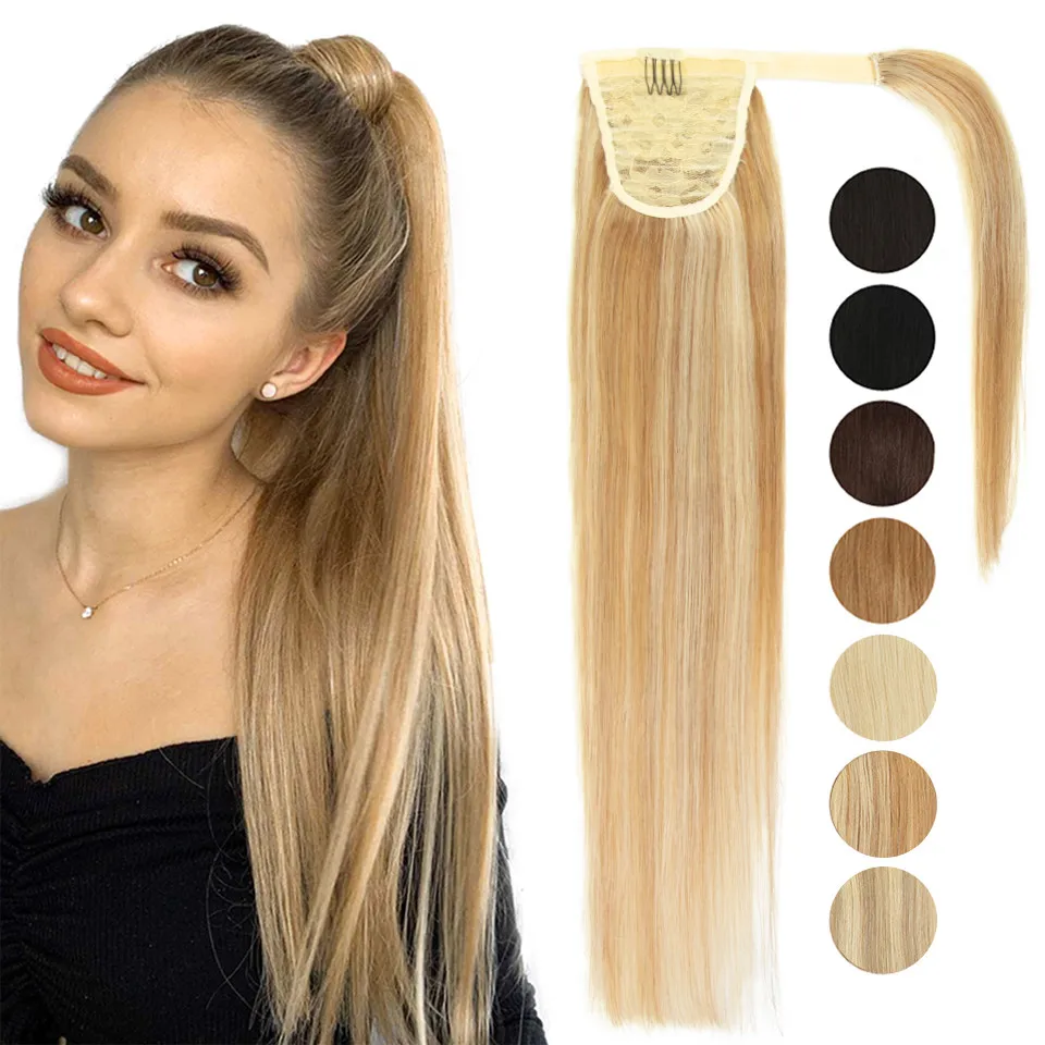 Precio bajo Señora De pelo Ponytail Clip del pelo humano Rubio hecho a máquina Remy postizos abrigo alrededor recto sedoso extensiones 14 "18 "22" nz9wD53O